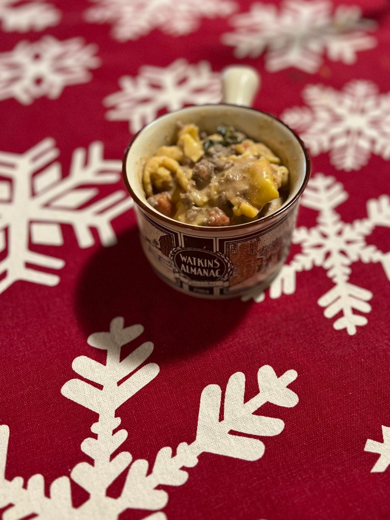 In a crockpot…1-2 lbs of cooked and drained ground sausage (I used beef), 1 box of chicken broth, 1 can of diced tomatoes, 1 large can of Rotel (I used 2 small), 1 block of cream cheese, 2-3 cups of milk, seasonings of choice (I used creole seasoning, pepper and garlic powder), small bag of spinach leaves, bag of frozen cheese tortellini