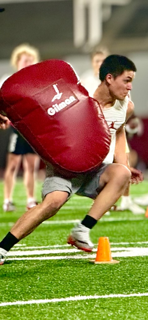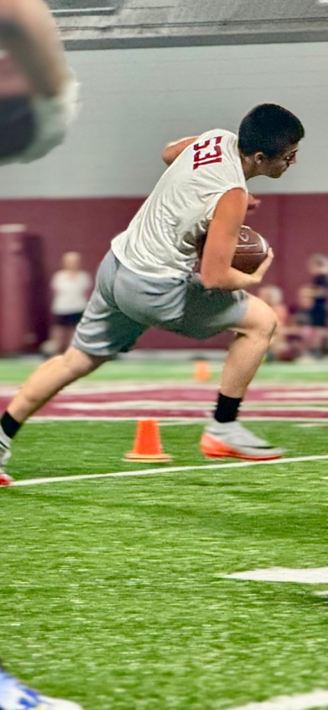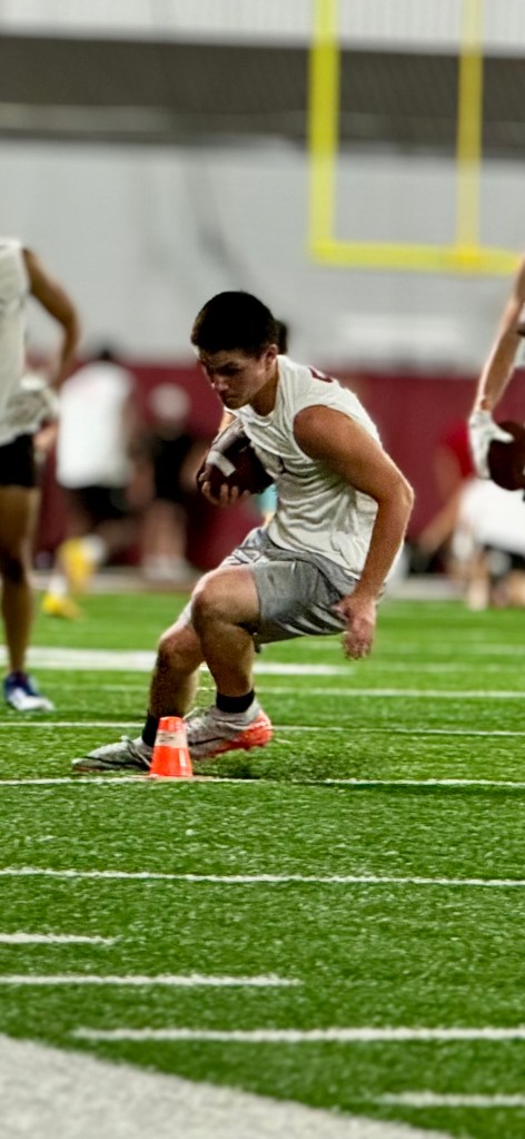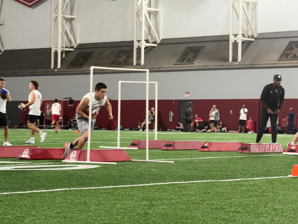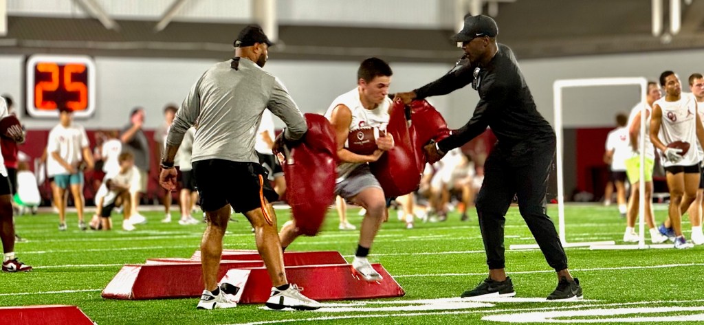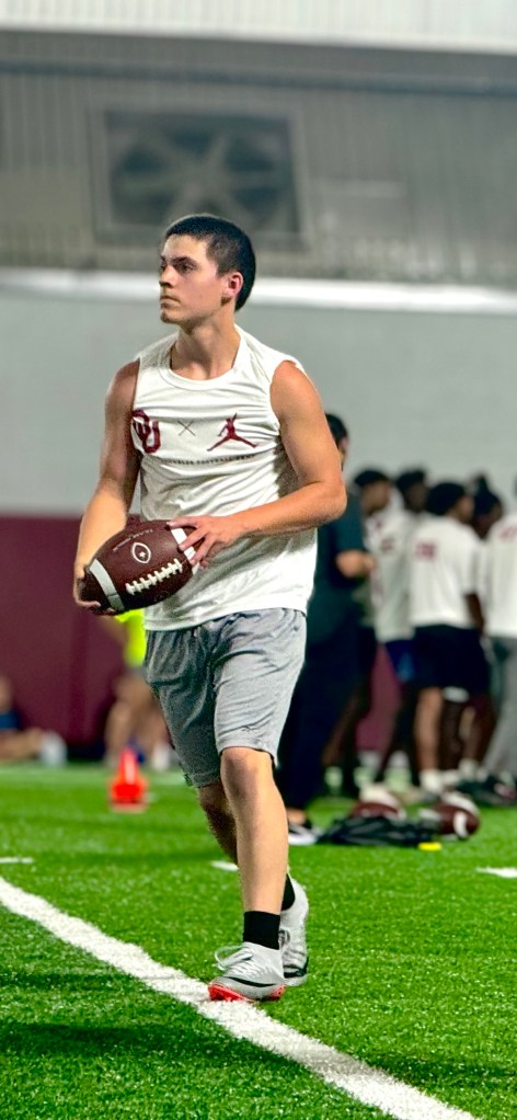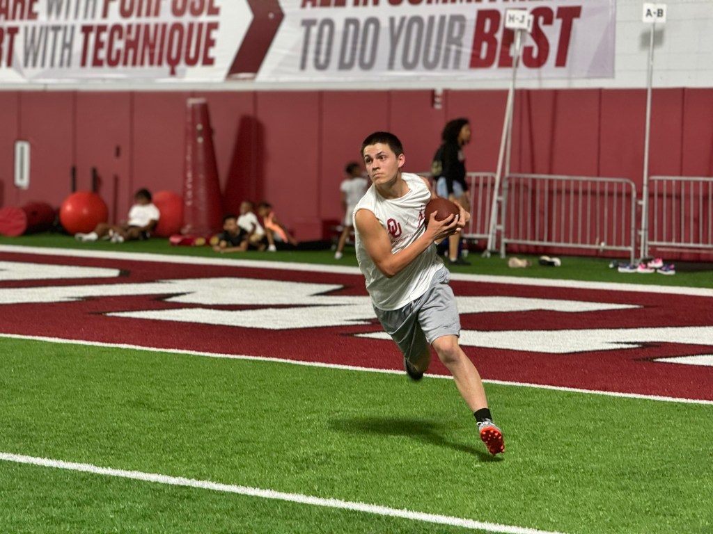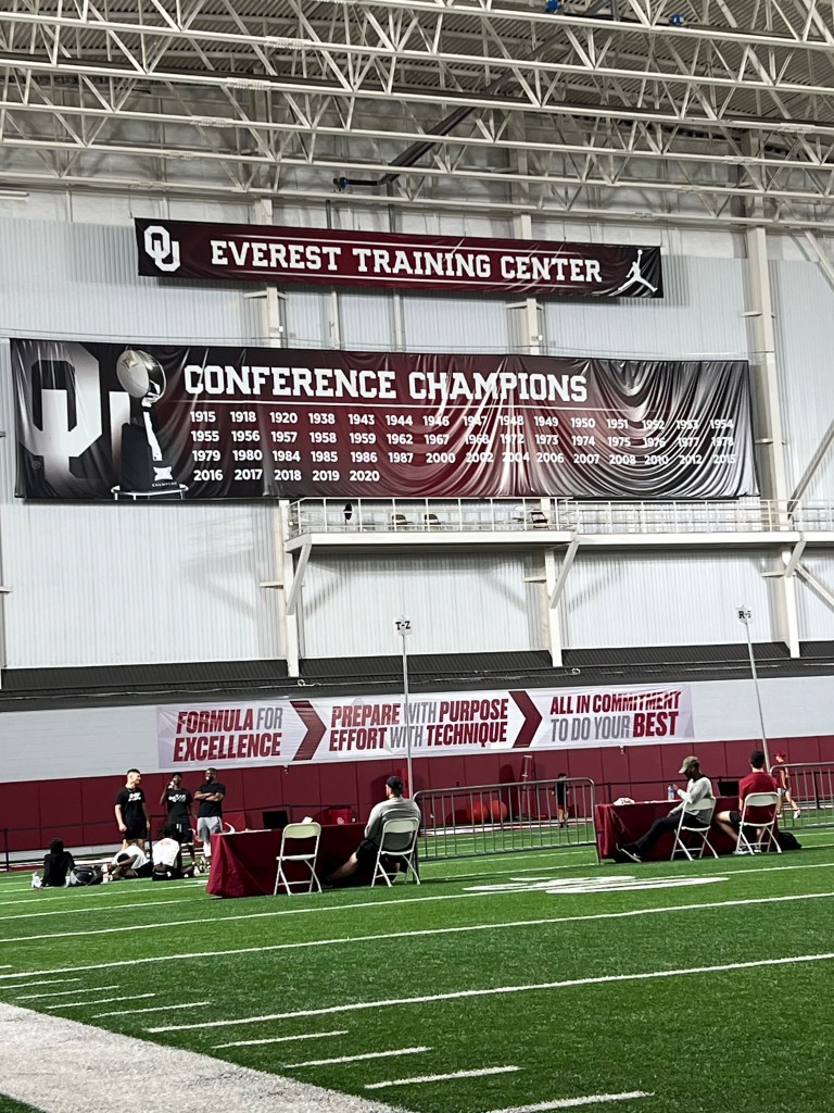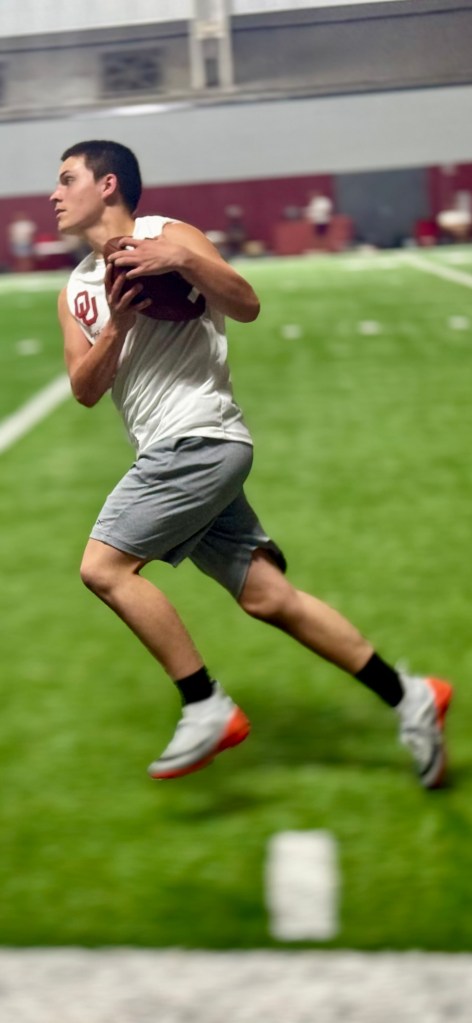 Yesterday, G had the opportunity to attend a football camp at OU. That place is very impressive. It’s huge and cream and crimson…everywhere! He was able to run some drills with some very good football players. Not too sure he had the best time, but he did do a good job while he was there.