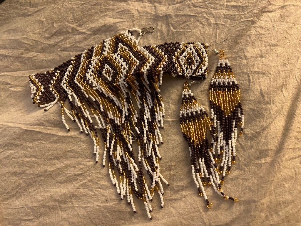 We went into an antique store downtown and I found the prettiest beaded choker and earrings. I was so glad I decided to get it. The employee there told us that an older gentlemen hand makes them. It is his thing that he enjoys doing. I wish he would have been there but nonetheless, it came home with me for only $30.