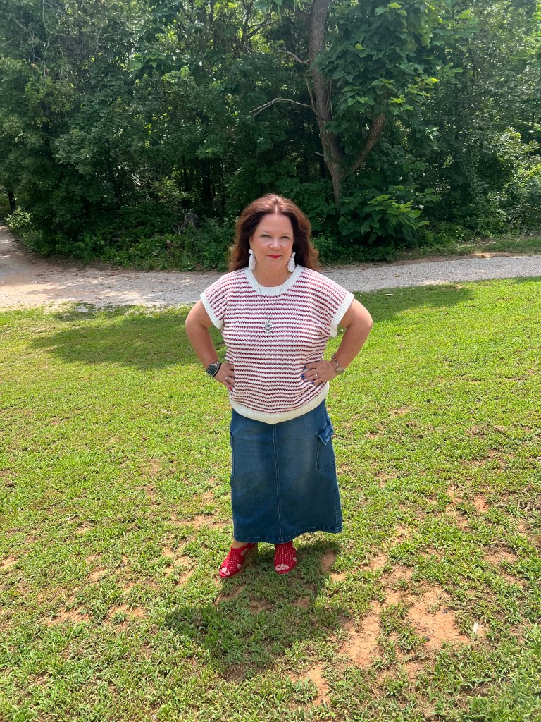 This outfit, I thought I would regret wearing since it’s so hot outside, but it ended up being okay. The denim skirt is from Cato, the sweater vest is from Amazon, the shoes are from Kohl’s, bracelet is from Junk Gypsy, necklace is from my dear friend, Kristie.