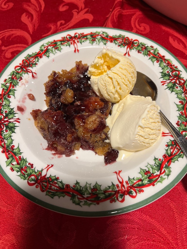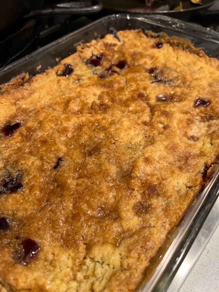 I sure hope everyone had a fantastic 4th of July. We had a very low-key day. MJ had to work so G and I just did some yard work in the morning before it got super hot. He is my super hero too…a baby copperhead made an appearance while we were mowing and I freaked out. He came to my rescue!! SO thankful he isn’t afraid to help momma out. Anyway, since it was just us, I baked some chicken thighs that had marinated in cranberry pomegranate salsa, zucchini and onion stir fry, deviled eggs, pasta salad and watermelon. We finished our meal with this delicious dump cake from Miss in the Kitchen. Y’all need to try this one out, super easy and oh so delish! We topped it with some Braum’s vanilla ice cream.