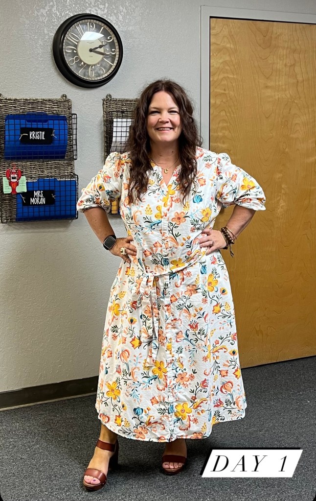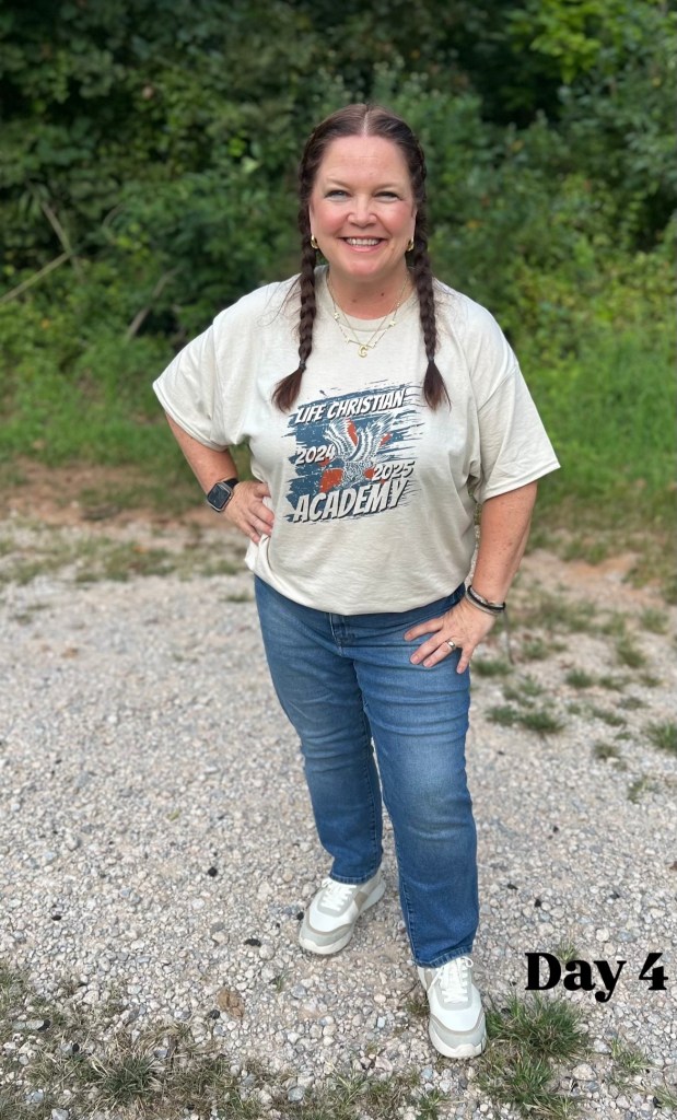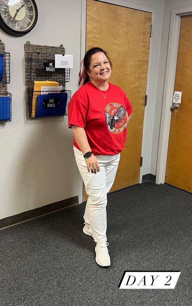 Day 4 is our Friday shirt this year. I will probably swap this one out with my others through the school year. I had forgotten to take my photo that morning, so this is once I got home after volleyball practice…hot, sweaty and disheveled lookin’. Paired this with some TH jeans and new tennis shoes I got from Versona on our heifer trip to Amarillo.