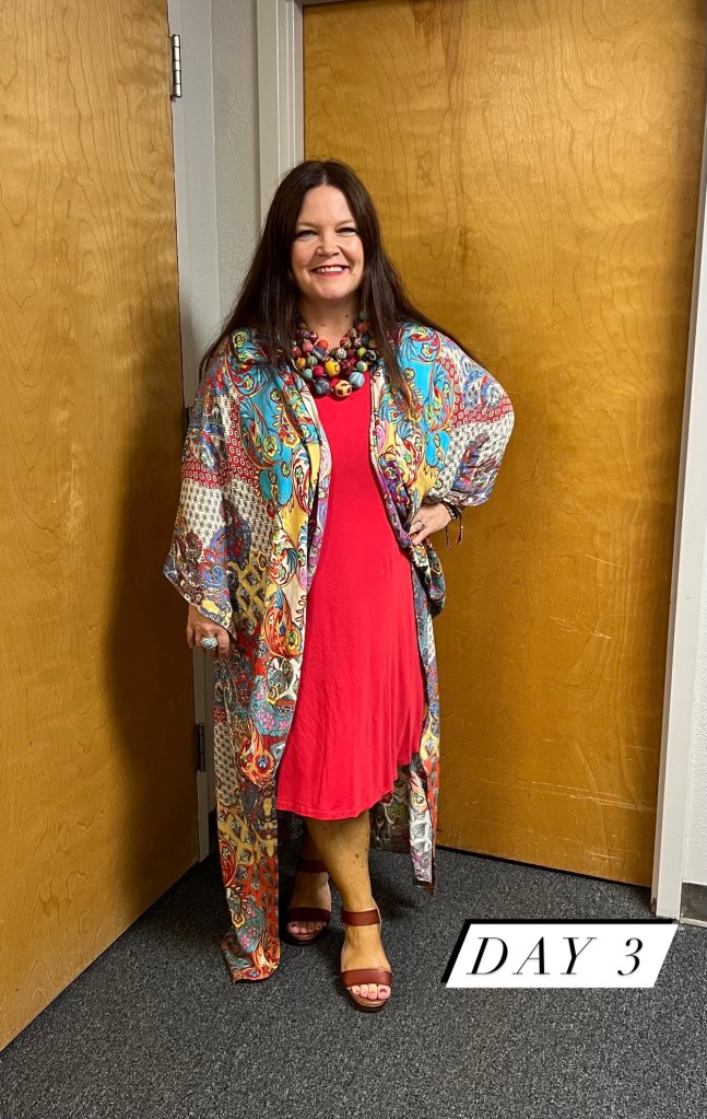 Day 3 is my fav of the week. This is the kimono and necklace that The Hubs bought me at Junk Gypsy for my birthday. This time I paired it with just a basic red throw on dress and brown sandals. Comfy and cool is what I am going for this week with the temps so high!!!